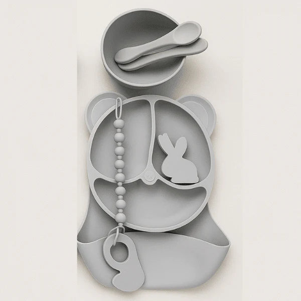 Set Includes: 1 divided plate with suction base, 1 bowl, 1 sippy cup with lid, 1 spoon, 1 teether, 1 bib, and matching accessories